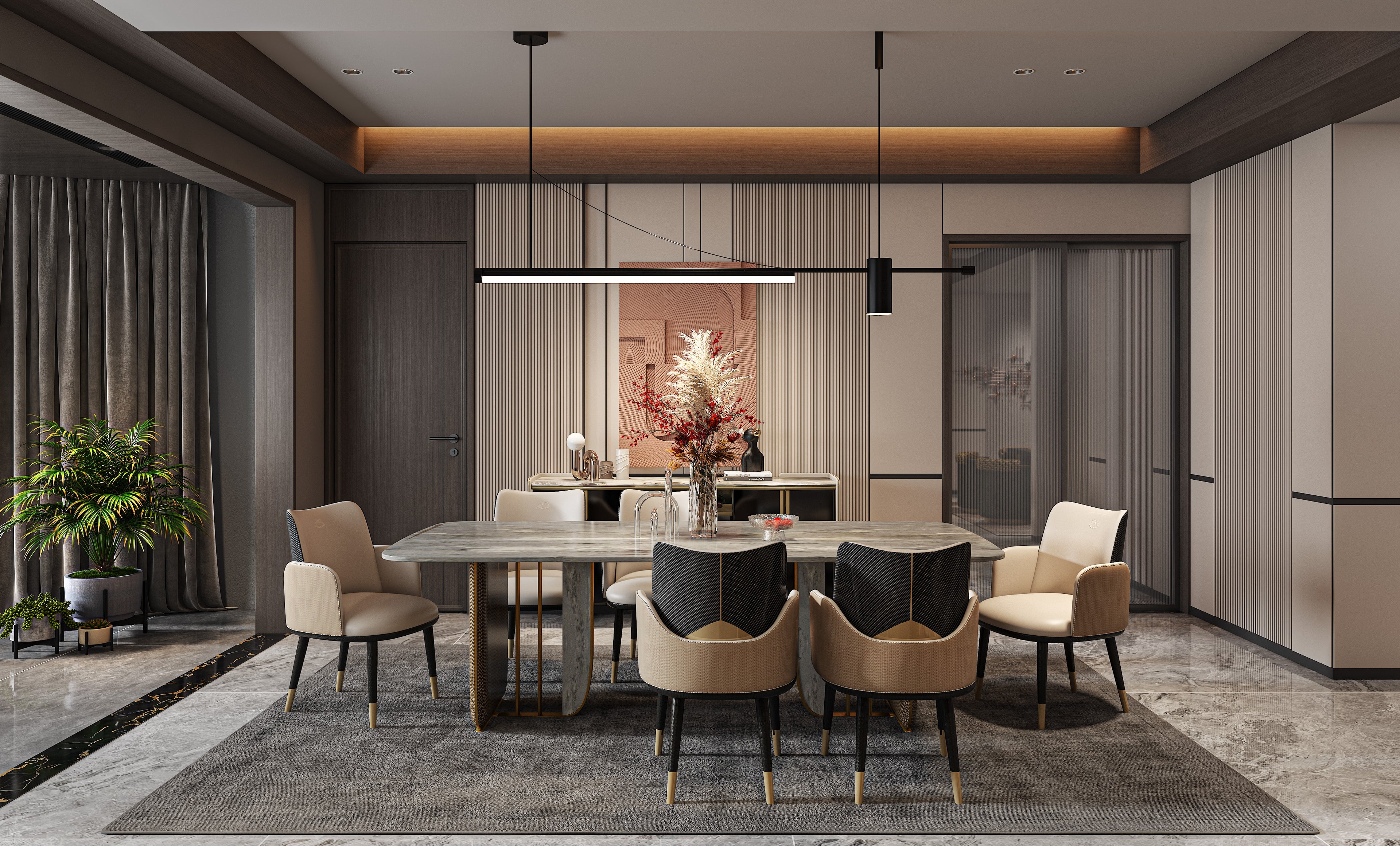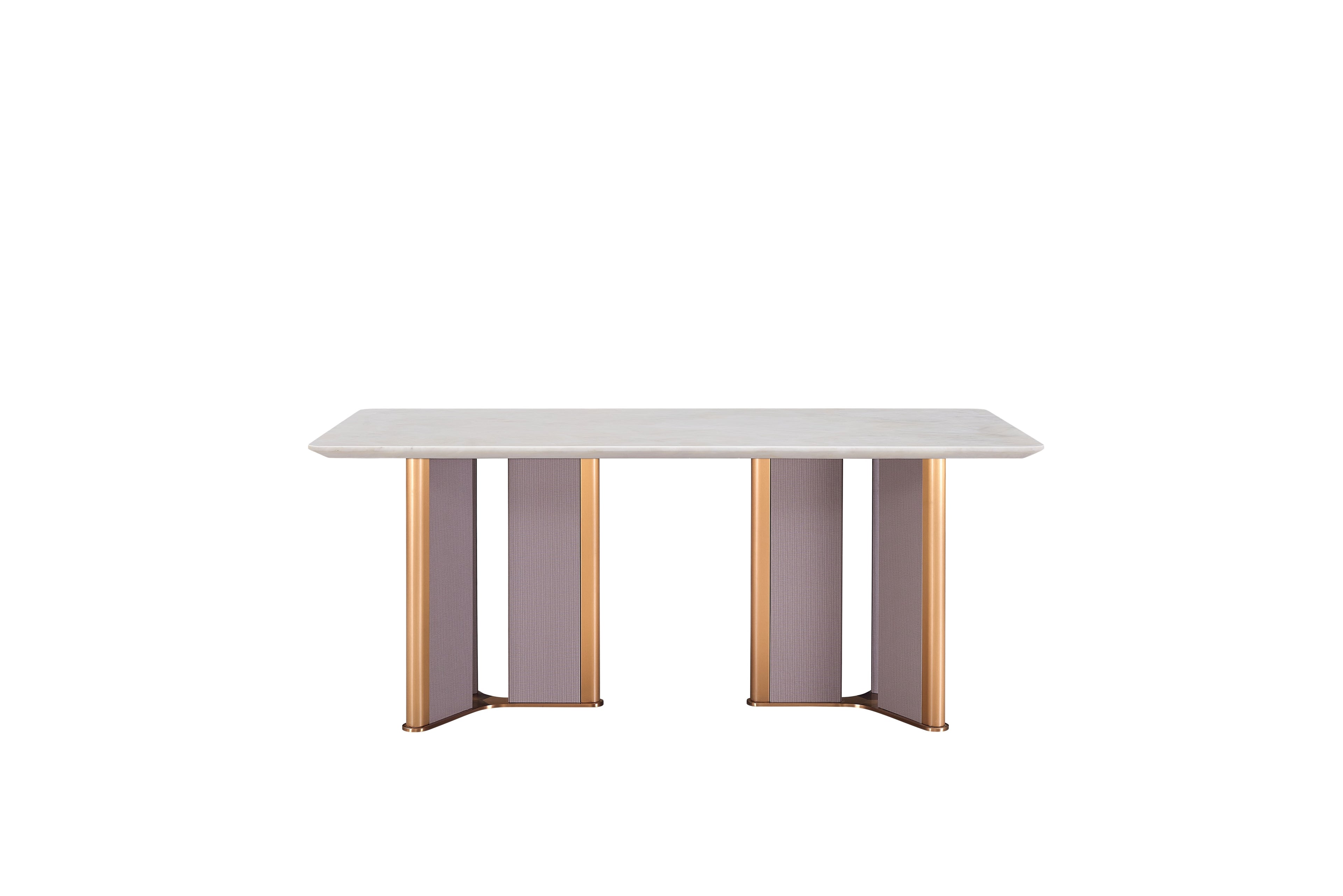 CK-02E-1 Rectangular White Marble Dining Table – Gold Framed Legs with Taupe Fabric Panels