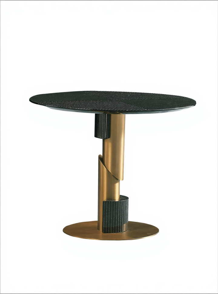 The AK-001G-2 Dining Table blends architectural elegance with bold material contrast, making it an ideal centerpiece for luxury interiors. The round tabletop is crafted in black stone with fine linear texture, creating visual depth and a sleek, contemporary surface.