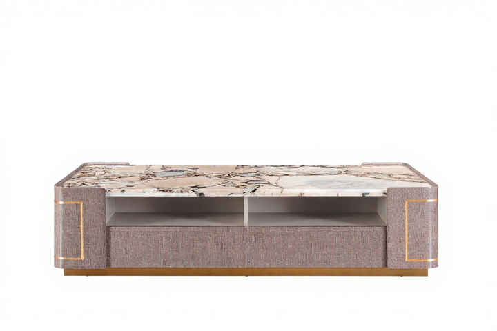 The AK-015G-2 Center Table marries sculptural elegance with functional design. Its broad surface is crafted from high-grade white marble, finely polished to showcase subtle veining and soft, rounded edges. The body is wrapped in a neutral-tone upholstery that conceals two push-to-open drawers, while a central open shelf provides graceful display space. Brushed-gold inlays frame the silhouette, creating a refined contrast that elevates both modern living rooms and sophisticated lounge areas.