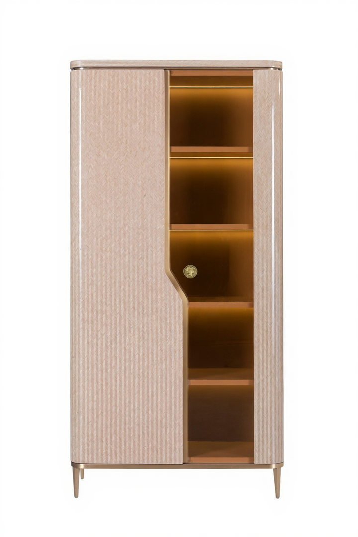 AK-016Q1 – Illuminated Display Cabinet with Curved Glass Door and Gold Accents