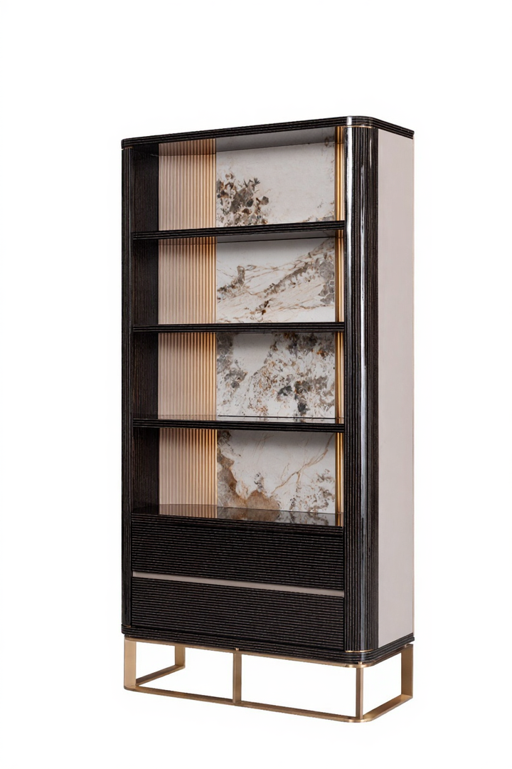 The AK-066Q2 elevates any luxury interior with its blend of architectural geometry and artistic presence. Featuring open shelves framed in ribbed black texture, this tall cabinet showcases decorative rear panels with abstract marble-like visuals and vertical golden accents that add both depth and richness.