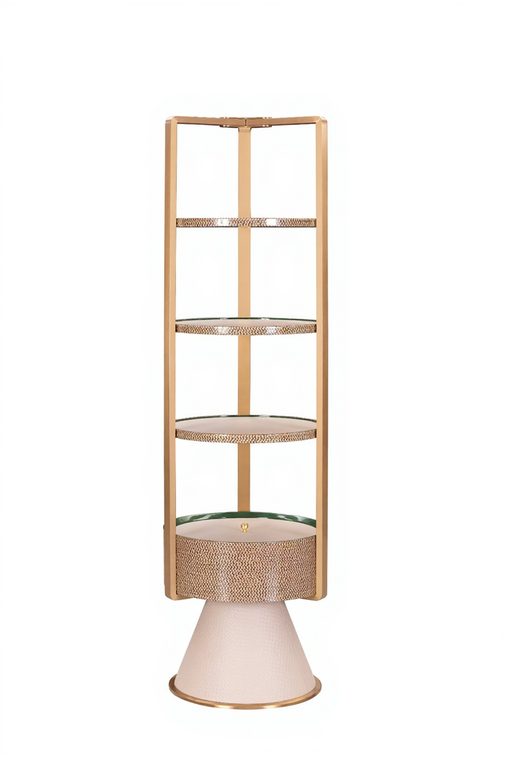 The AK-088M Rotating Bathroom Console redefines functional luxury with a sculptural design tailored for refined spaces. Crafted to fit elegantly in any corner, this piece features a champagne-gold frame with four circular tiers — three of them open with glass insets and leather-wrapped edges, and the bottom tier offering a concealed compartment with a pivoting lid.