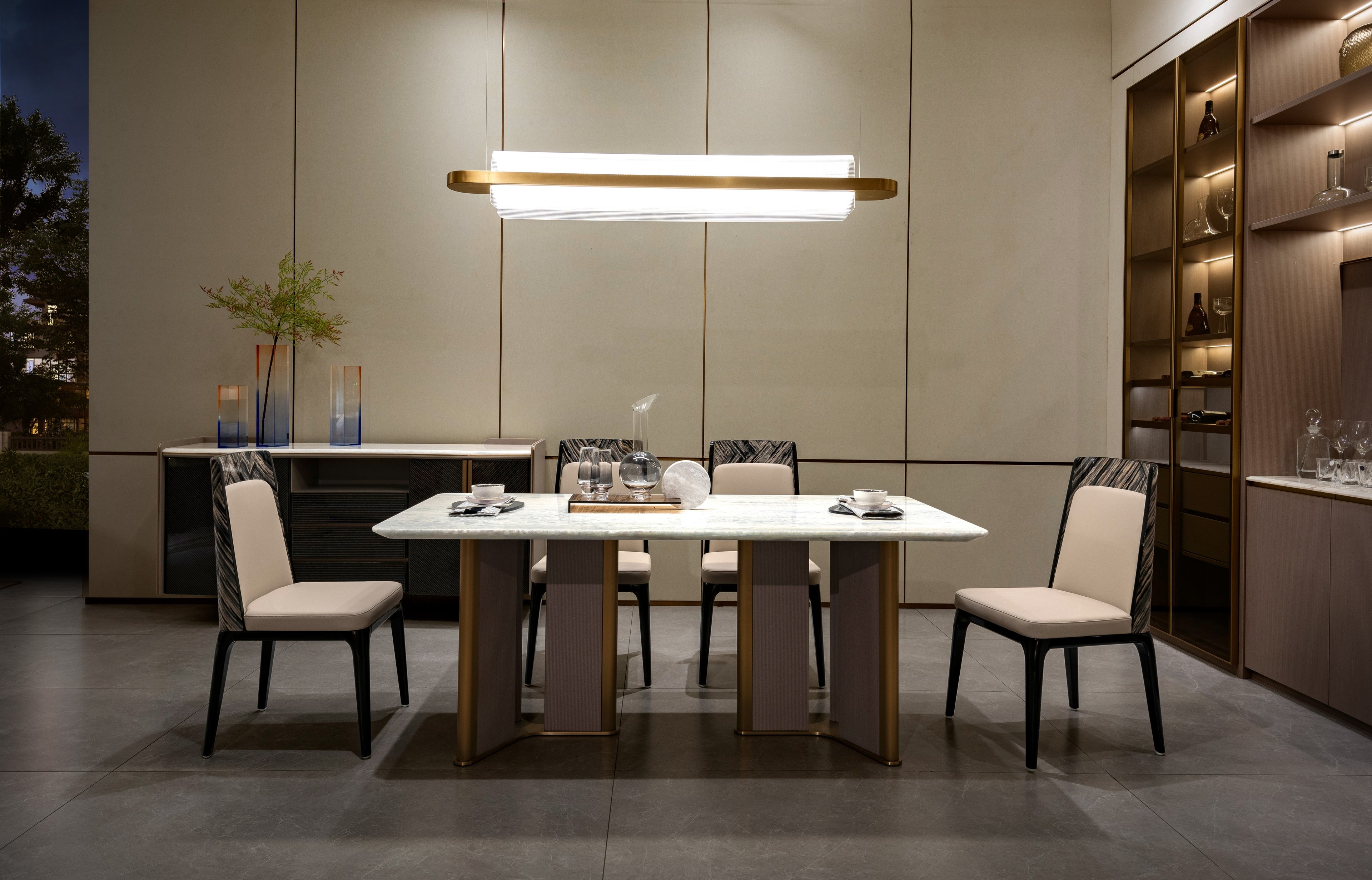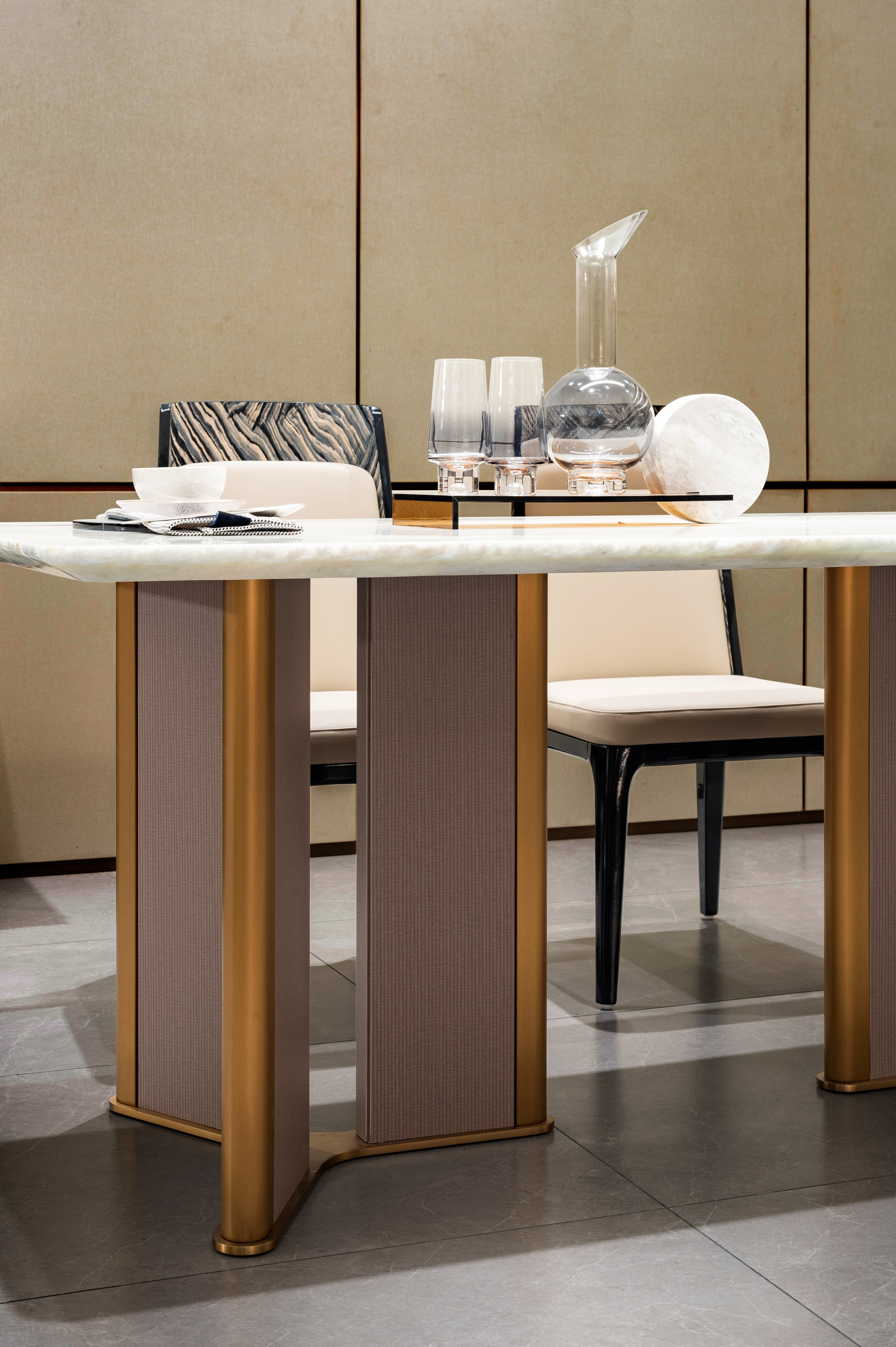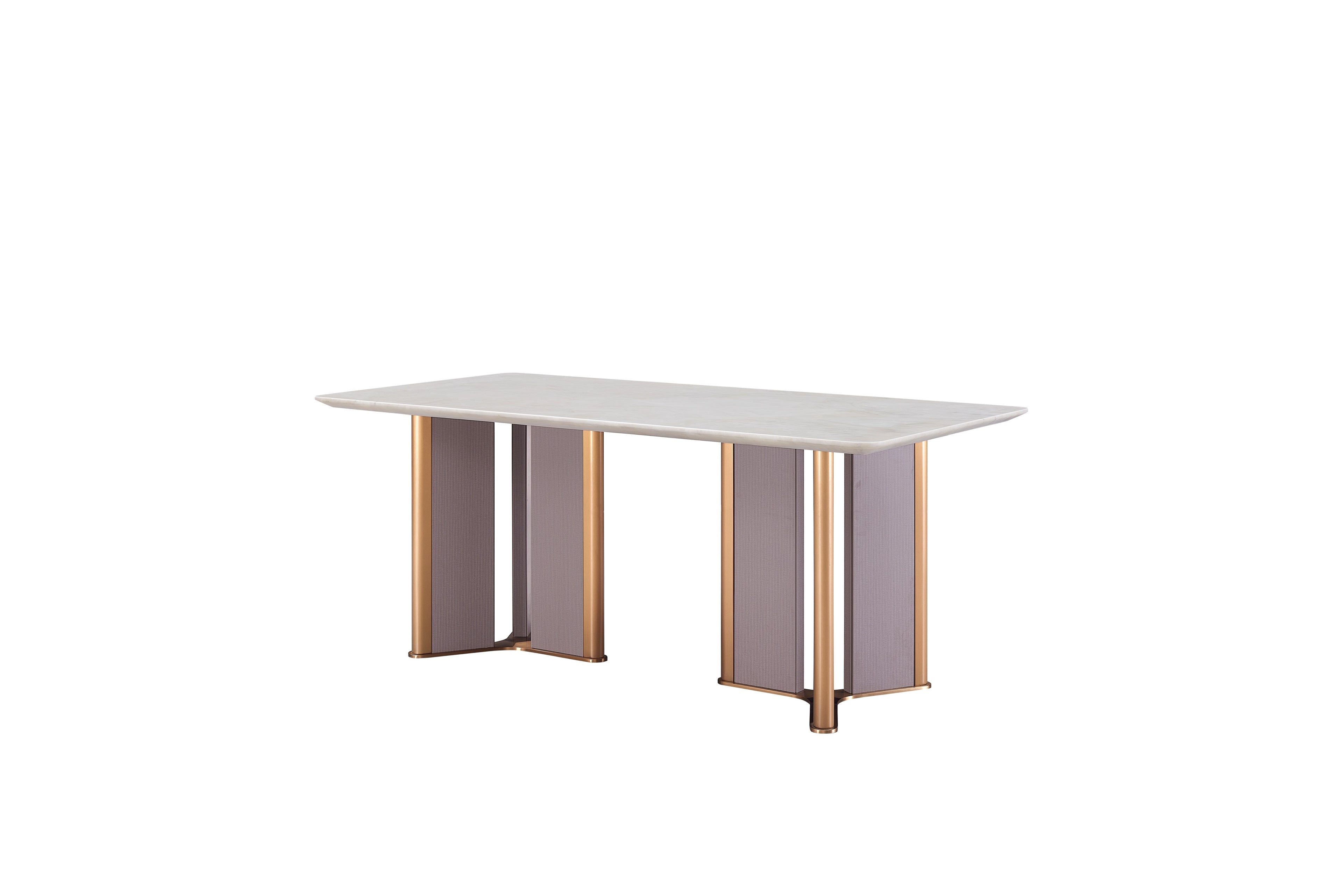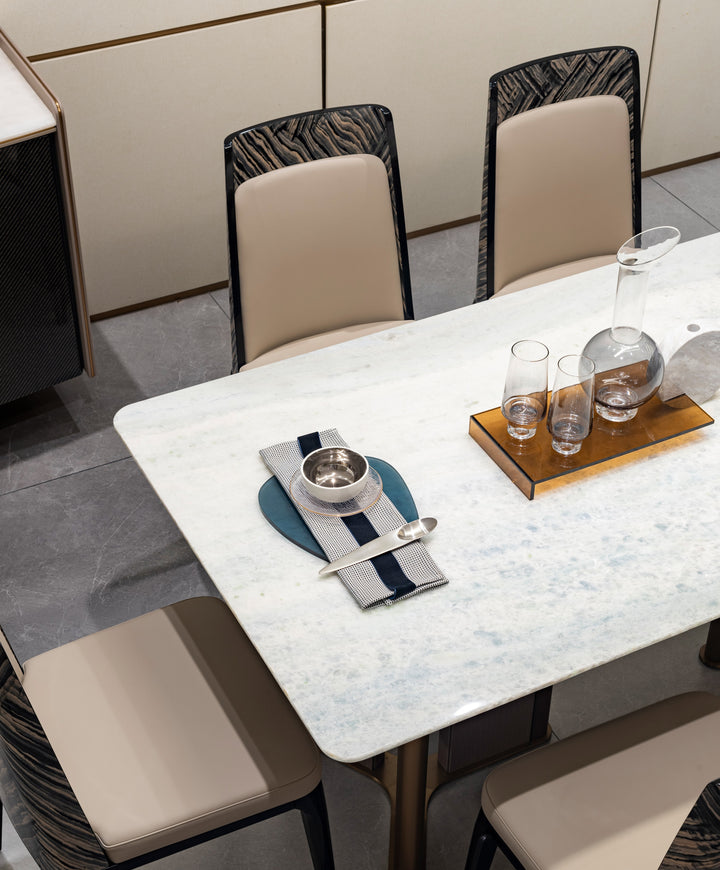 CK-02E-1 Rectangular White Marble Dining Table – Gold Framed Legs with Taupe Fabric Panels