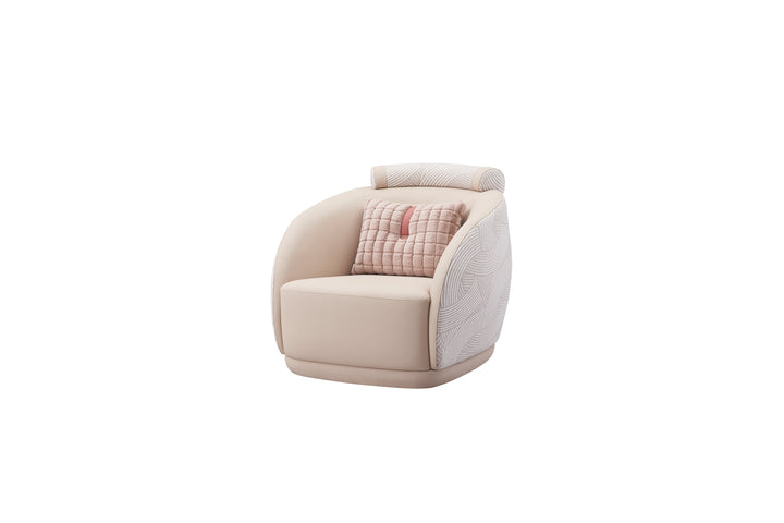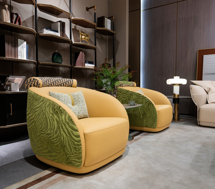 The CK-S601 accent chair is a bold fusion of playful design and refined comfort. Wrapped in supple beige leather, its sculptural silhouette embraces a plush seat and rounded back, delivering both visual impact and ergonomic support. The chair’s outer panels are upholstered in a textured green fabric with a subtle, wavy pattern, offering a tactile contrast that enhances its charm.