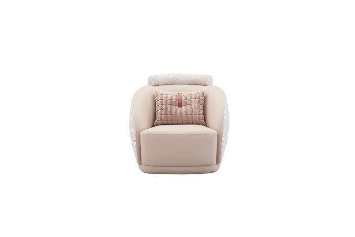 A cylindrical headrest featuring a patterned motif adds an artistic touch, while the coordinating decorative cushion introduces further texture and elegance. This piece blends craftsmanship and creativity, perfect for luxury lounges, boutique hotel lobbies, or sophisticated living rooms.