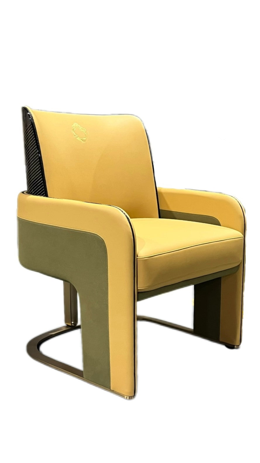 The backrest is adorned with a carbon-textured shell for a modern contrast, topped with an embroidered crest for a subtle signature touch. Luxurious velvet panels enrich the lower frame, complementing the smooth faux leather upholstery. A brushed gold cantilevered base adds a final statement of opulence and stability.
